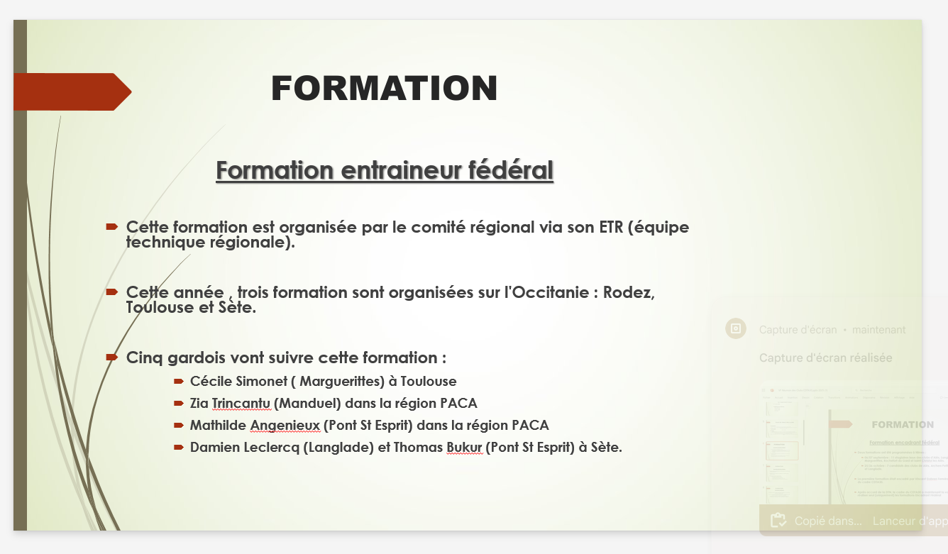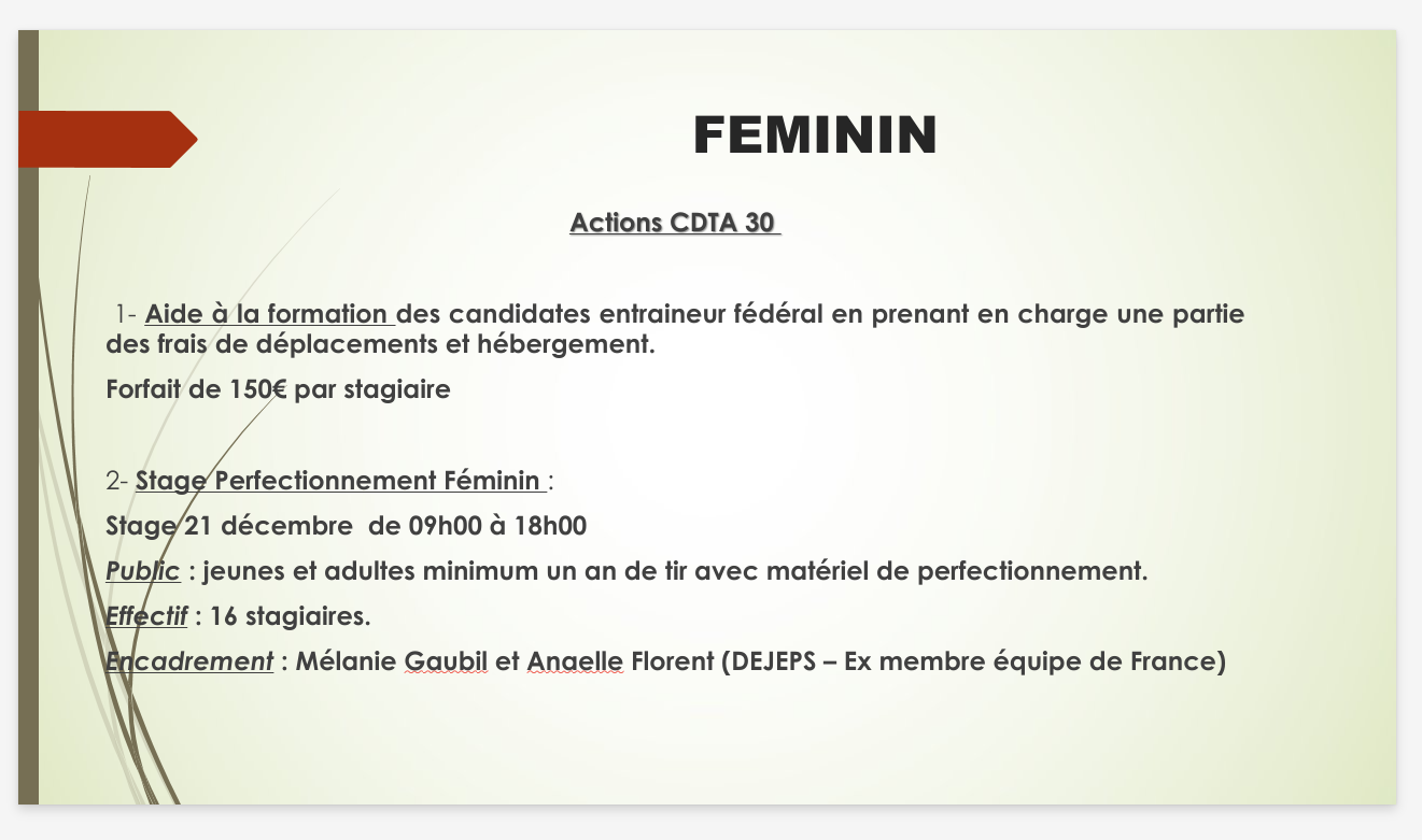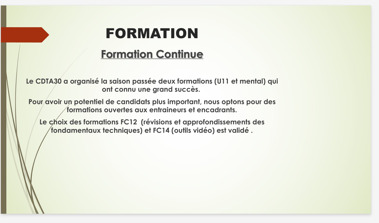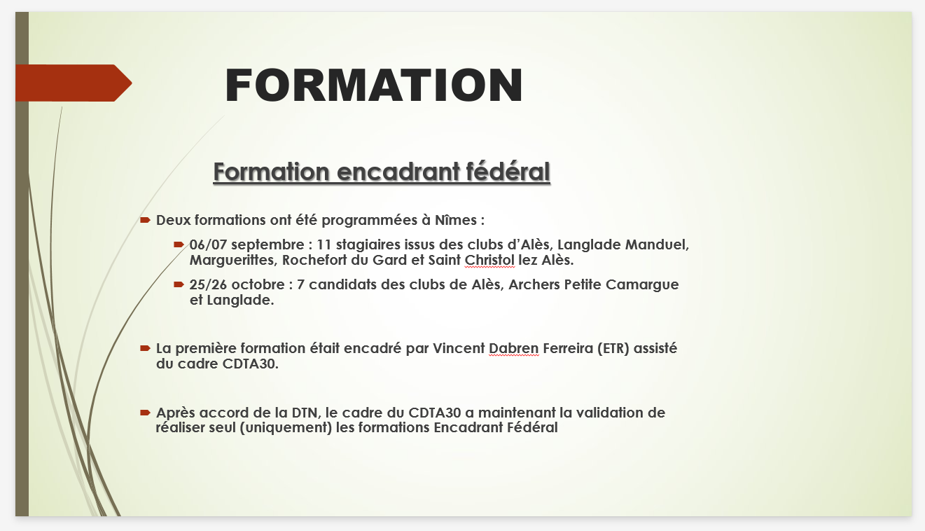 – des formations pour devenir encadrant fédéral : Après accord de la DTN, le cadre du CDTA30 a maintenant la validation de réaliser seul (uniquement) les formations Encadrant Fédéral. ( septembre 2025).