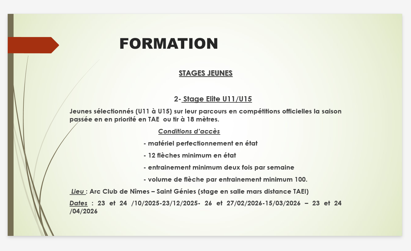 Stage Élite : Réservé aux jeunes archers plus expérimentés, ayant déjà une expérience de la compétition en extérieur en TAE, ce stage sera l’occasion de perfectionner sa technique, d’améliorer sa précision et de se préparer aux prochains défis.