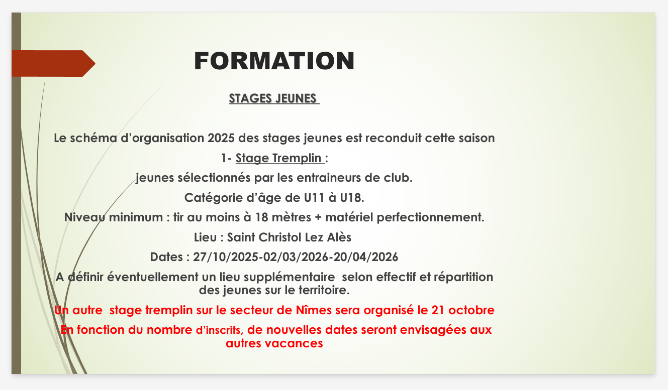 – 1 journée de stage « tremplin » pour chacune des deux zones ( Stage accueilli par L’ arc Club de Saint Christol Lez Ales et l’arc club de Nimes)